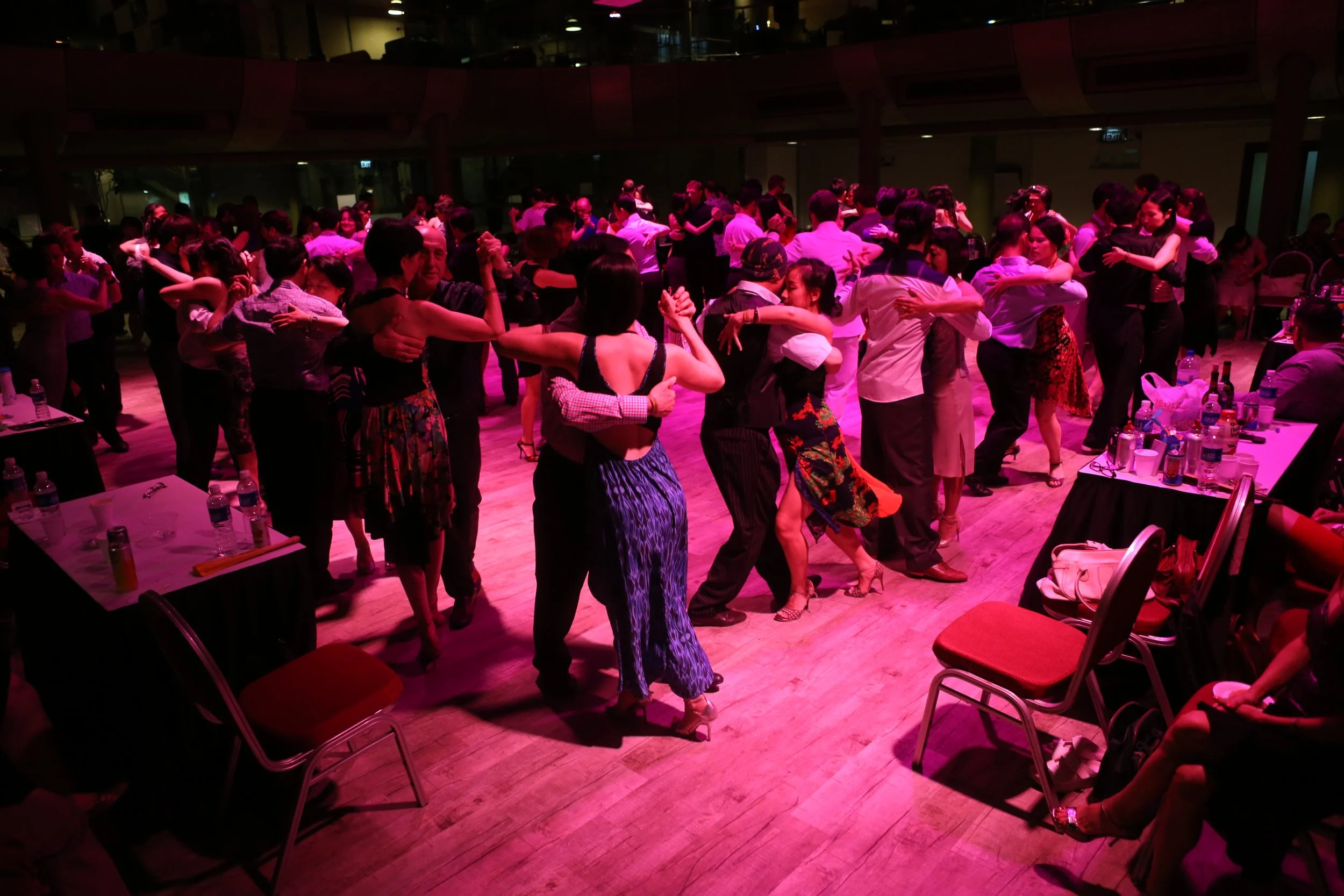 Couples dancing together at the 2016 singapore tango marathon while under pink lighting, surrounded by onlookers at tables.